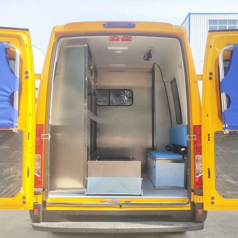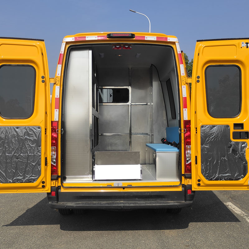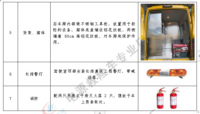車輛搭載夜間照明燈,監控攝像存儲,數據傳輸,音像系統,氣體防護設備,傷員簡單救護,氧氣供應,擔架急救和辦公語音調度等現場作業設備。額定載客:4-7人。